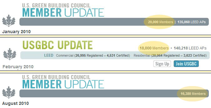 You may remember a post from February back where I noticed the USGBC reported a decline in membership on their Member Update newsletters. I noticed today that that membership has declined further, dropping to 16,380 from a peak of 20,000 reported in January 2010.